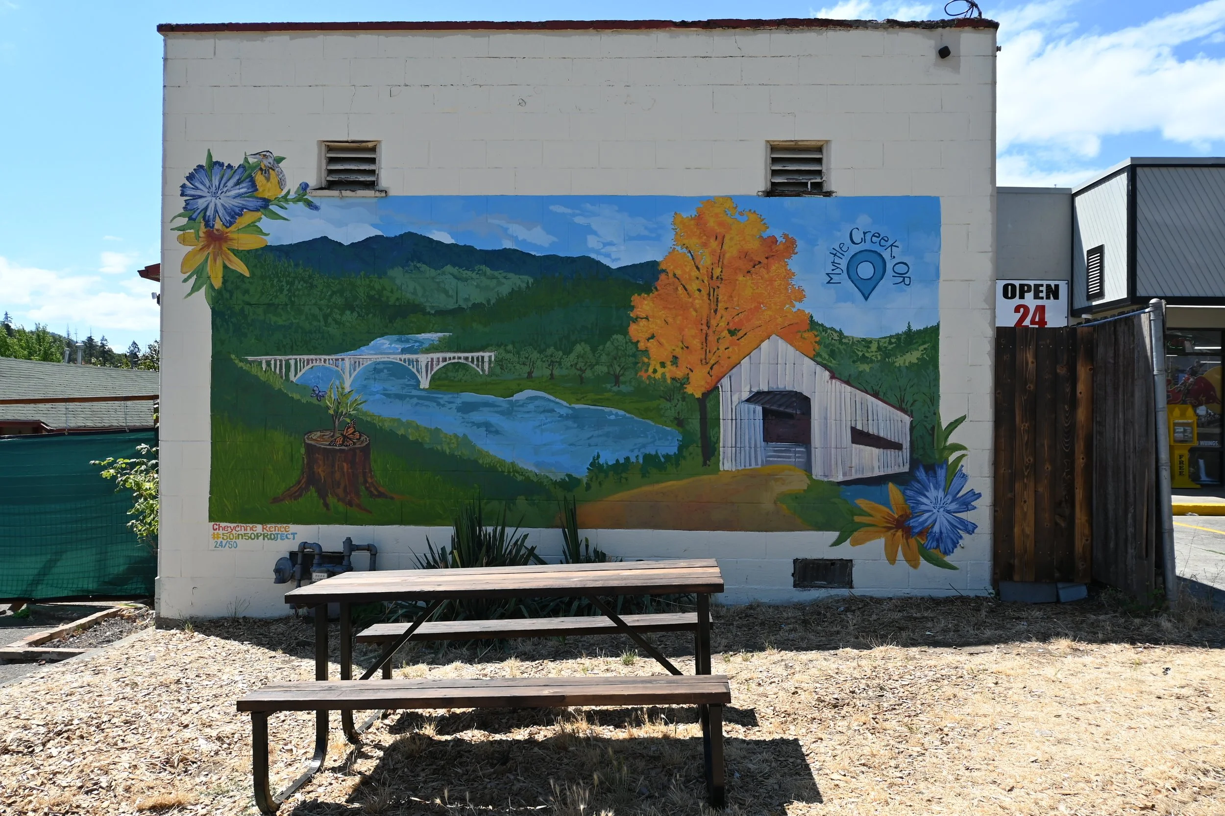 My quest to capture all of Oregon’s covered bridges intersected with Cheyenne Renee’s quest to paint murals in all 50 states. The Myrtle Creek mural is number 24 on her quest.
