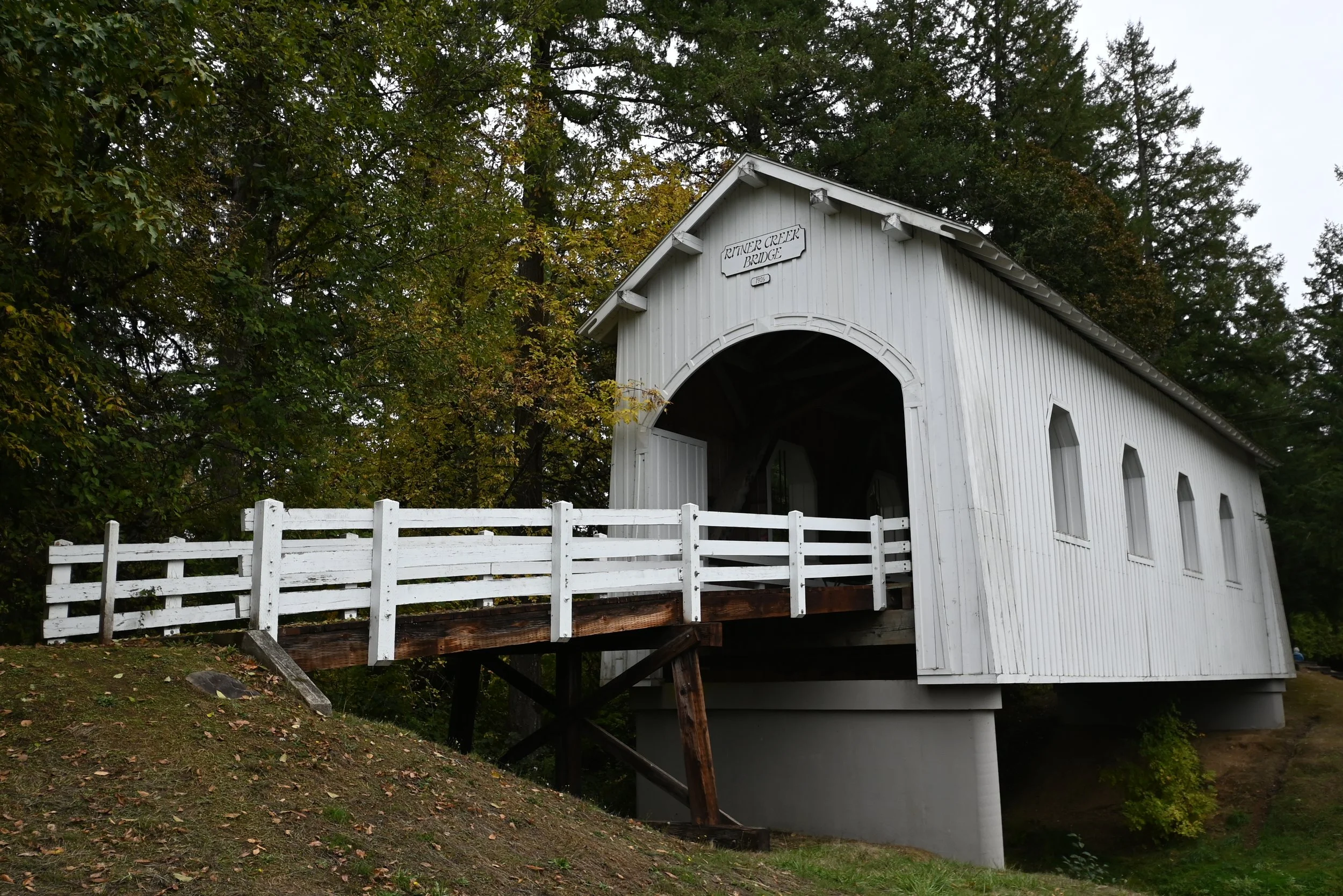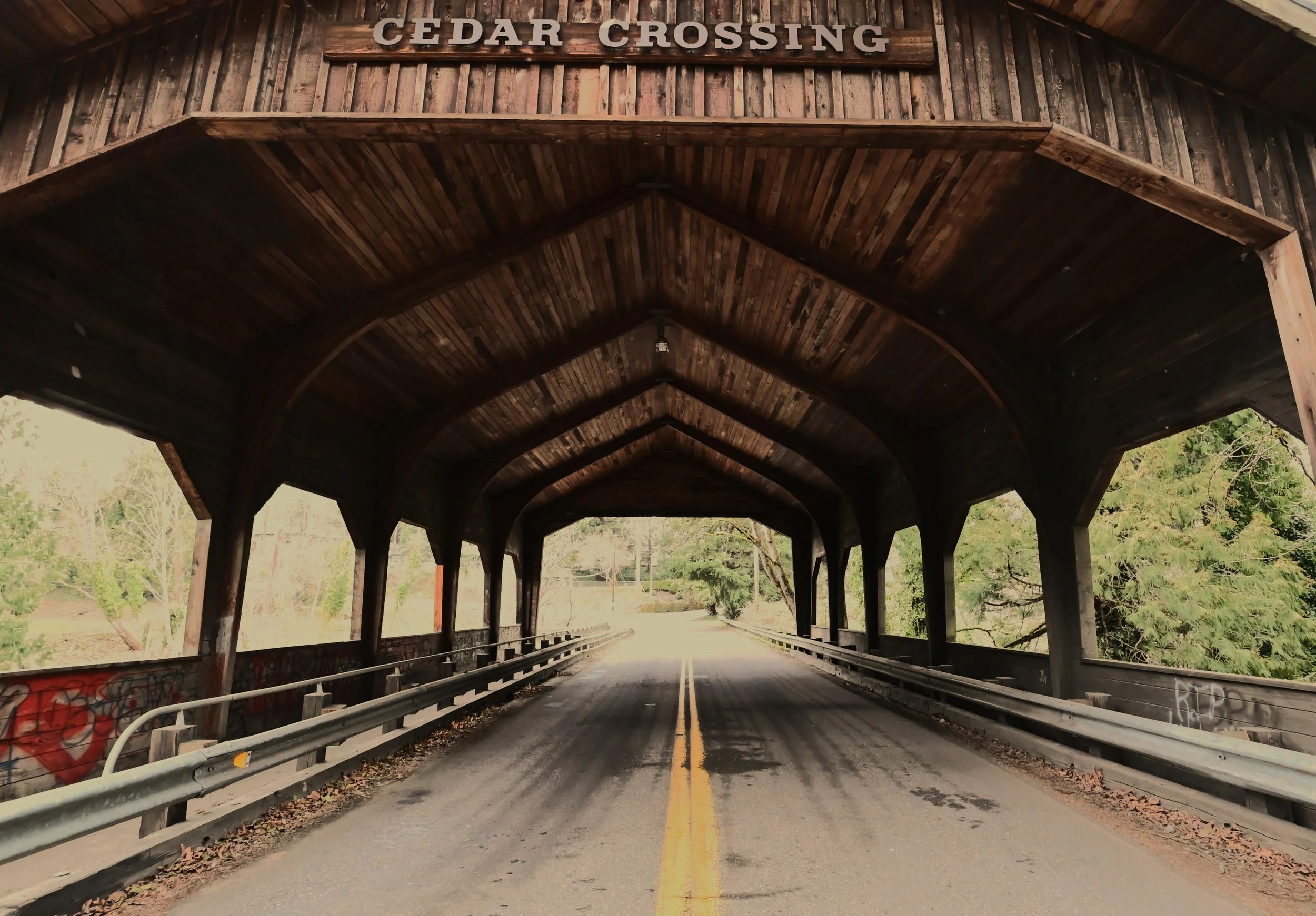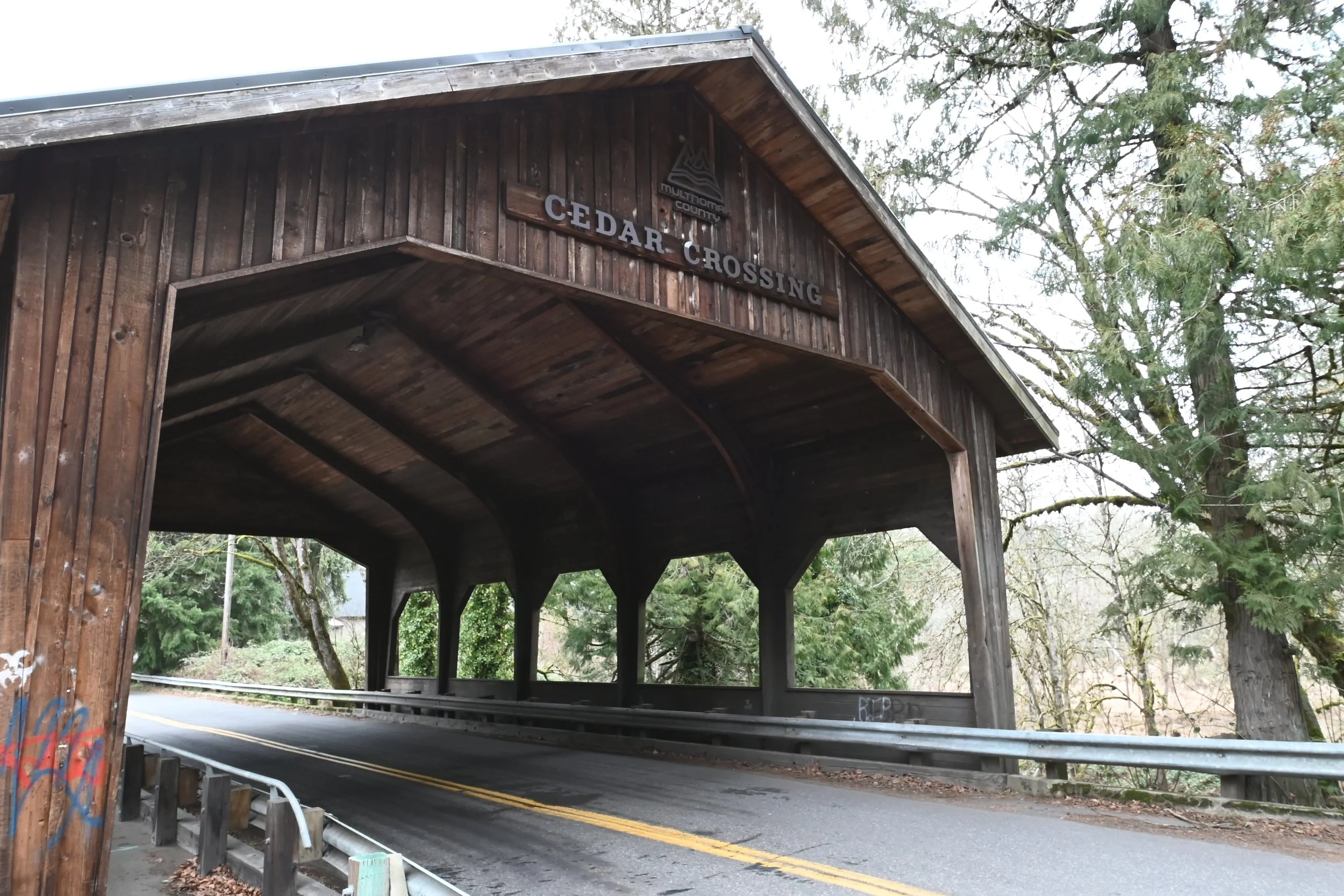 Cedar Crossing is located in Multnomah county. It was built in 1982 and honors Oregon’s history and love of covered bridges. It is an active bridge. Please have a friend join you to keep an eye out for vehicles.